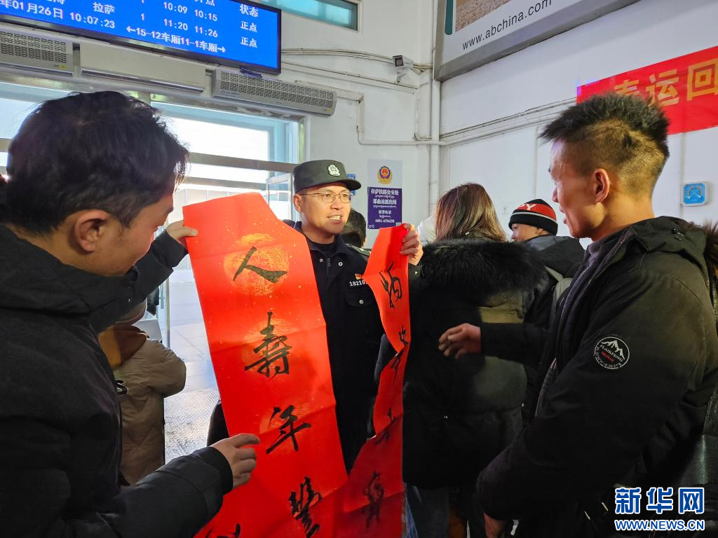 在候車大廳,那曲站派出所邀請(qǐng)那曲市文聯(lián)4名書法家在現(xiàn)場(chǎng)為群眾寫春聯(lián)、送去新春的祝福。