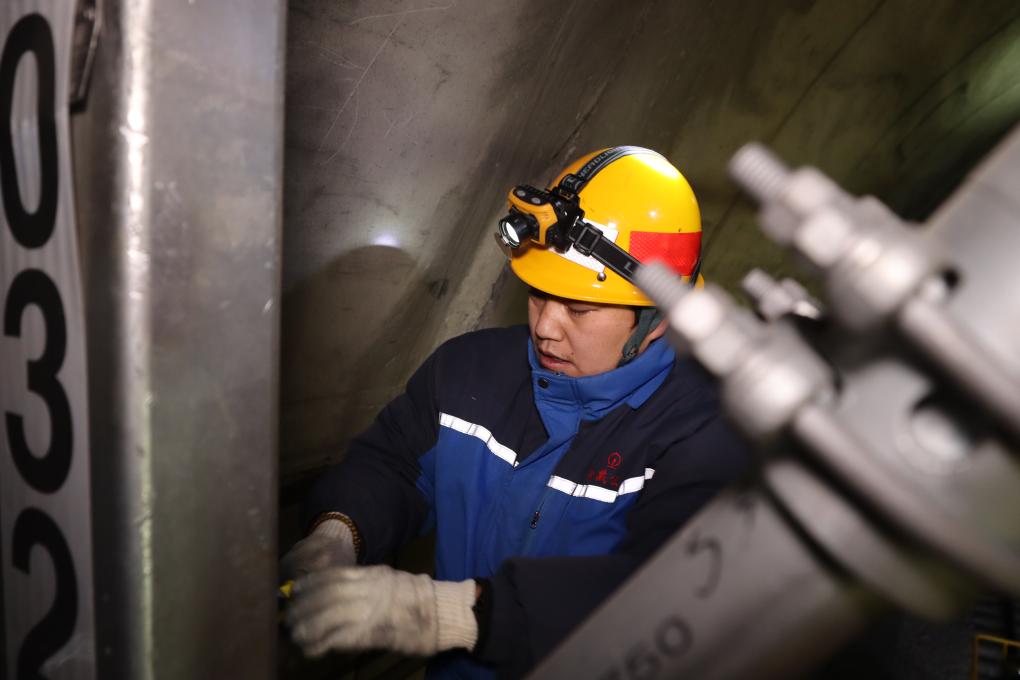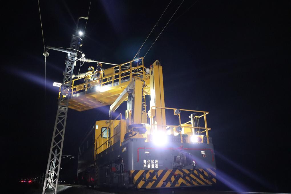 維護(hù)進(jìn)行時(shí),專用的接觸網(wǎng)軌道作業(yè)車的兩節(jié)車廂緩緩解列,分別駛向全長(zhǎng)13公里的接觸網(wǎng)作業(yè)區(qū)段兩端。拉薩的冬夜寒風(fēng)刺骨,溫度低至零下10攝氏度,工人們穿著絕緣鞋,將兩端接觸網(wǎng)接掛地線,正式開(kāi)始作業(yè)。