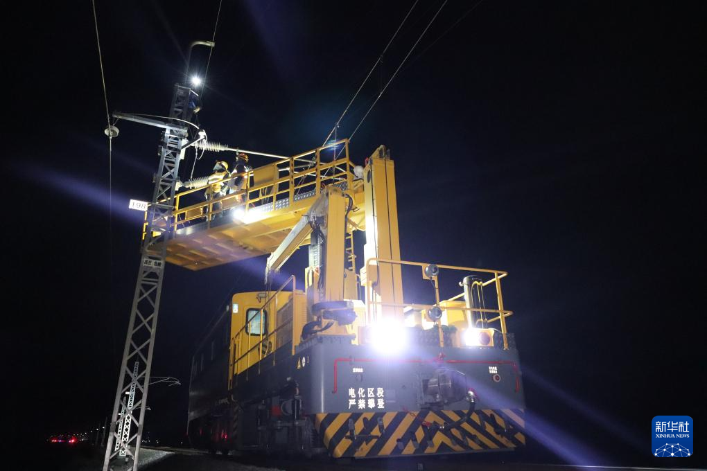維護進行時,專用的接觸網(wǎng)軌道作業(yè)車的兩節(jié)車廂緩緩解列,分別駛向全長13公里的接觸網(wǎng)作業(yè)區(qū)段兩端。拉薩的冬夜寒風(fēng)刺骨,溫度低至零下10攝氏度,工人們穿著絕緣鞋,將兩端接觸網(wǎng)接掛地線,正式開始作業(yè)。