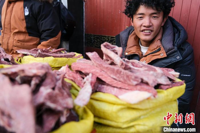 2月5日,來自那曲市班戈縣的年輕牧民格桑云丹守在自己的風(fēng)干牦牛肉攤位前。中新社記者 江飛波 攝