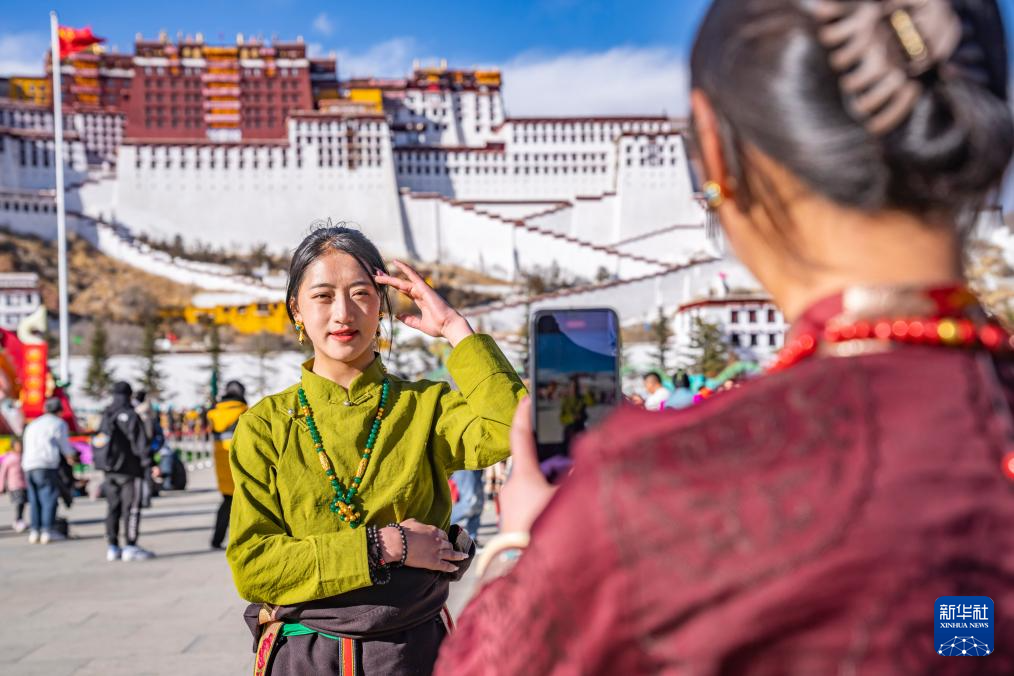 2月11日,來自四川甘孜的游客在布達(dá)拉宮廣場(chǎng)上拍照留念。新華社記者 孫非 攝