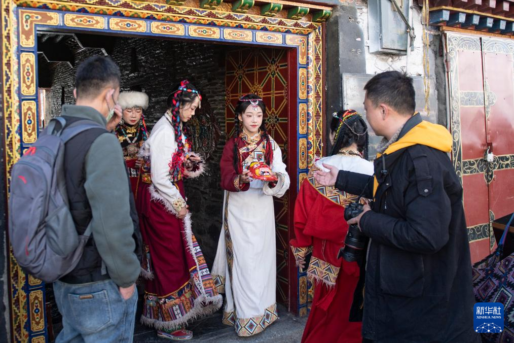2月11日,在西藏拉薩八廓街,游客準(zhǔn)備拍攝藏裝紀(jì)念照。新華社記者 孫瑞博 攝