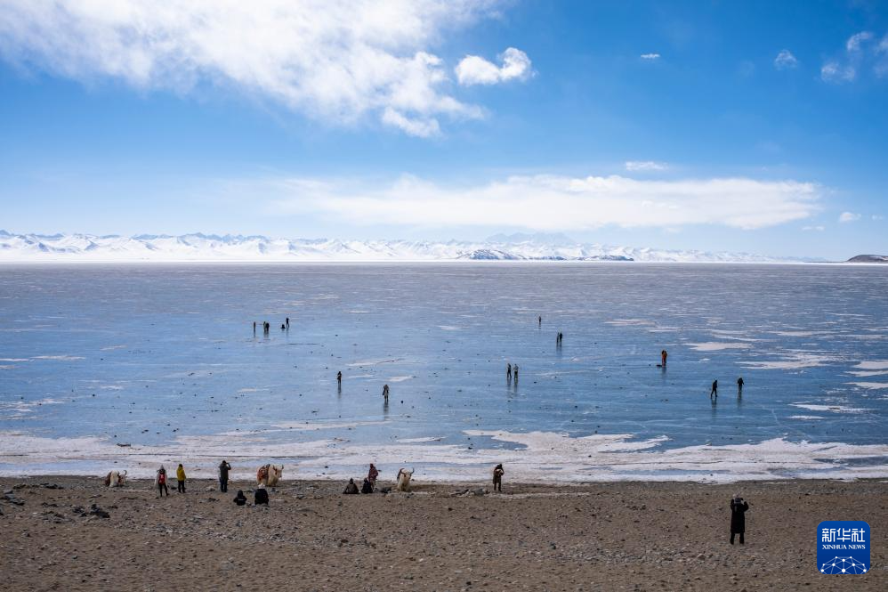 2月8日,游客在結(jié)冰的納木錯(cuò)湖面上游玩。新華社記者 孫非 攝