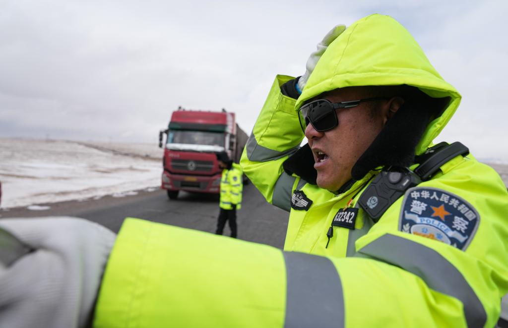 安多交警大隊(duì)交警在大風(fēng)中指揮交通。新華社記者 晉美多吉 攝