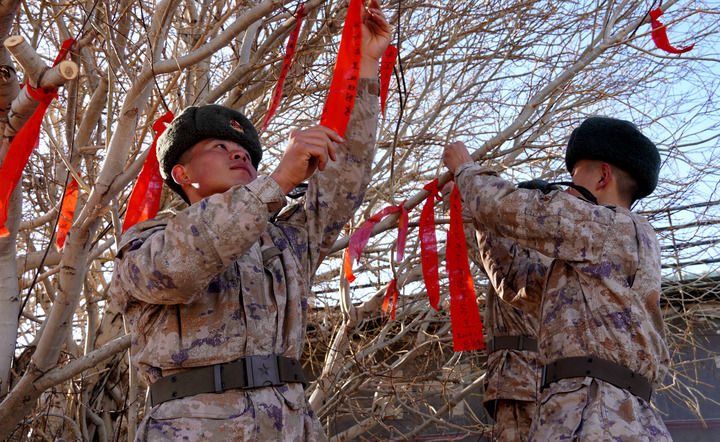 新春佳節(jié)來臨之際,阿里軍分區(qū)某邊防團(tuán)扎西崗邊防連戰(zhàn)士在“先遣柳”前懸掛心愿布帶,寄語新年祝福(2024年1月17日攝)。新華社記者 陳尚才 攝