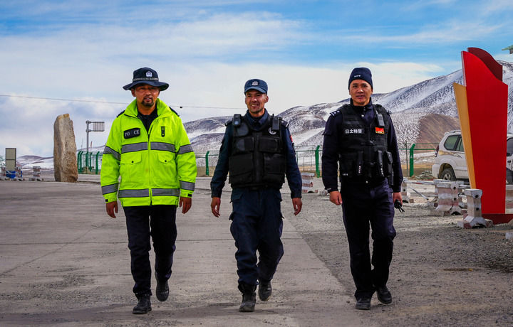西藏阿里地區(qū)日土縣泉水湖公安一級(jí)檢查站的民警在檢查站巡邏(2023年11月8日攝)。新華社記者 陳尚才 攝