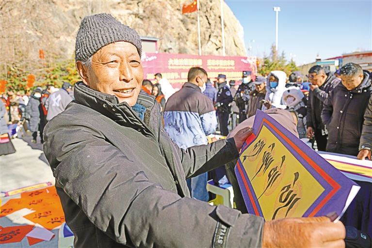 山南市文聯(lián)組織書法家走進(jìn)瓊結(jié)縣,開展“我們的中國夢——文化進(jìn)萬家”活動(dòng)。圖為群眾展示獲贈(zèng)的藏文書法作品。