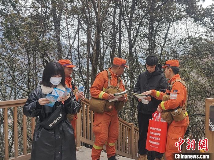 圖為森林消防員為進(jìn)山入林游客發(fā)放防火宣傳手冊(cè)。張靖椿 攝