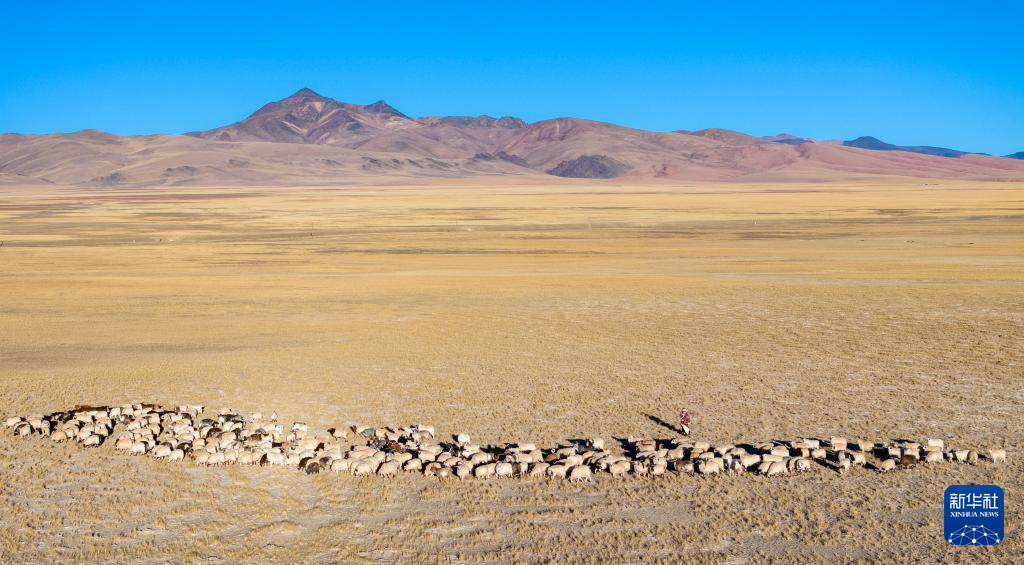 丹增在尼瑪縣俄久鄉(xiāng)馬遷村老家的草場(chǎng)上牧羊(無(wú)人機(jī)照片,2023年12月18日攝)。新華社 姜帆 攝
