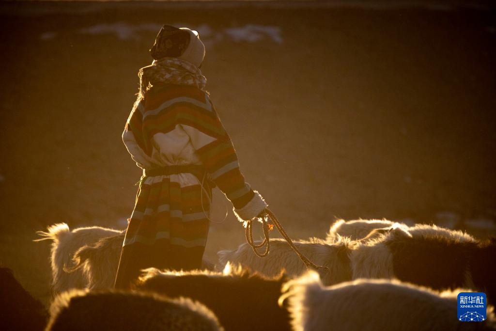 丹增在尼瑪縣俄久鄉(xiāng)馬遷村老家的草場(chǎng)上牧羊(2023年12月18日攝)。新華社 姜帆 攝