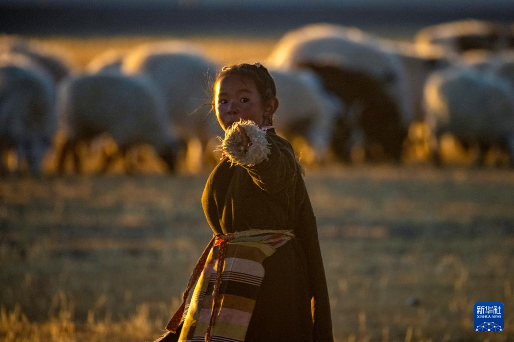 丹增4歲的小妹妹拉姆卓瑪在牧場(chǎng)上迎接姐姐趕羊入圈(2023年12月18日攝)。新華社 姜帆 攝