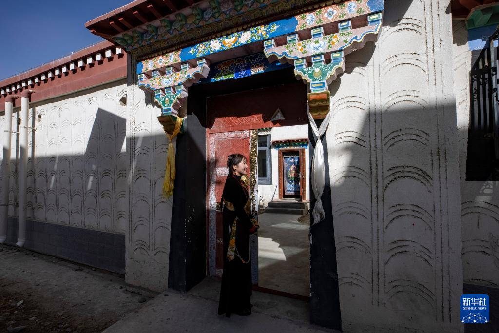 丹增在森布日生態(tài)搬遷安置點(diǎn)的新家門(mén)前(2024年1月24日攝)。新華社 姜帆 攝