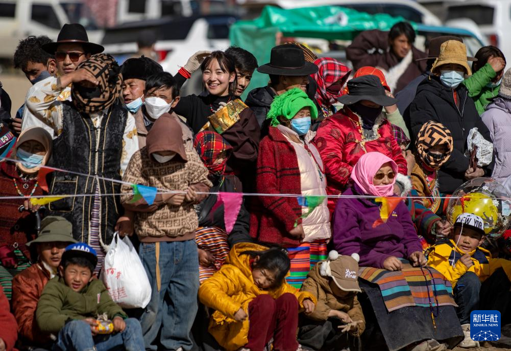 丹增(中)在森布日生態(tài)搬遷安置點(diǎn)觀看賽馬(2024年1月24日攝)。新華社 姜帆 攝