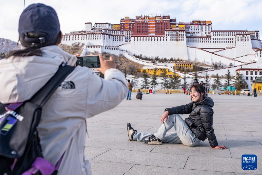 在拉薩市布達(dá)拉宮廣場(chǎng)上,丹增(右)正在拍照留念(2024年1月28日攝)。新華社 孫非 攝