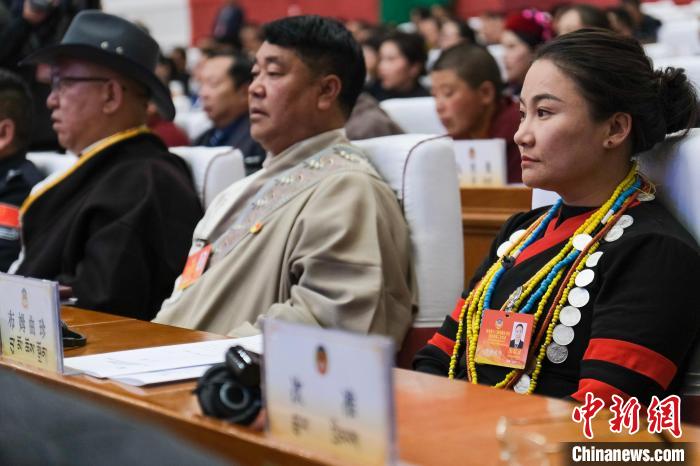 資料圖為2024年1月9日,西藏自治區(qū)兩會期間,少數(shù)民族界政協(xié)委員、墨脫縣達木珞巴民族鄉(xiāng)女鄉(xiāng)長布姆曲珍(右一)在拉薩參會。江飛波 攝