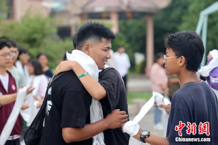 2022年6月,江蘇省南通市,南通西藏民族中學高三畢業(yè)生在離別前與校友告別。徐培欽 攝