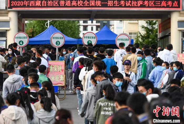 2020年7月7日,拉薩三高考點外,考生有序排隊進入考場。何蓬磊 攝