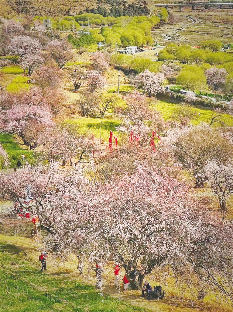 4月的嘎拉村寒意未盡,卻春意盎然。桃花競相開放,簇?fù)砩狡隆2簧儆慰鸵呀?jīng)提前到來,在村子里觀看舞蹈表演、拍照留念。嘎拉村村主任尼瑪多吉介紹,嘎啦村共33戶150人,黨員19名。村子因漫山遍野的野桃林而遠(yuǎn)近聞名,桃林總面積為270多畝,有野桃樹1253棵。2023年,桃花源景區(qū)共接待游客11萬人次,實現(xiàn)旅游收入340余萬元,其中門票收入310萬元。進駐餐飲、文創(chuàng)、旅拍、民族文化體驗等各類企業(yè)和個體工商戶共28家,創(chuàng)收31萬元。預(yù)計戶均增收10萬元。