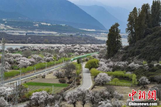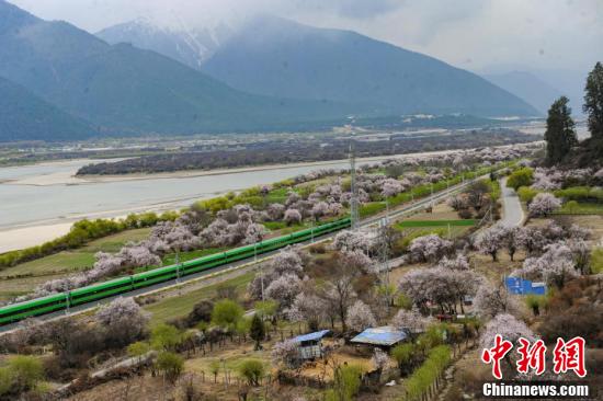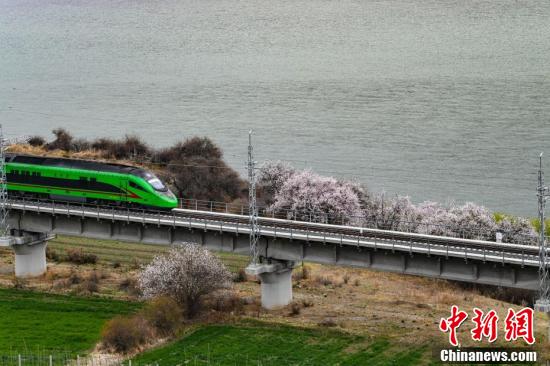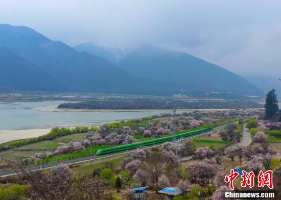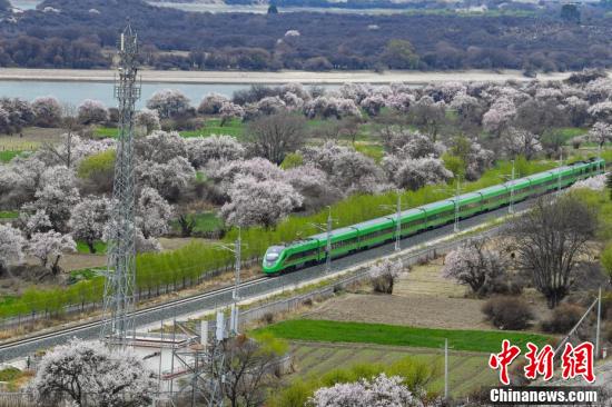 穿梭在桃花林中的拉林鐵路高原復(fù)興號。