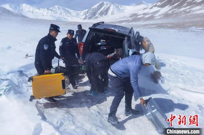 警車出發(fā)后行駛約1個(gè)小時(shí)抵達(dá)救援現(xiàn)場(chǎng)附近,由于道路積雪,事發(fā)地海拔超過(guò)5300多米,車輛無(wú)法繼續(xù)前行,民警徒步到達(dá)現(xiàn)場(chǎng),先用便攜式氧氣瓶給高反嚴(yán)重的游客供氧。隨后民警對(duì)現(xiàn)場(chǎng)進(jìn)行察看,發(fā)現(xiàn)車輛深陷積雪中,靠人力已無(wú)法脫困,決定先將被困人員及車上貴重物品帶回。