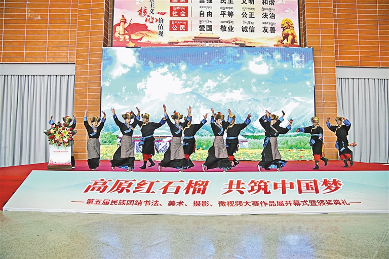 28日,“高原紅石榴 共筑中國(guó)夢(mèng)”第五屆民族團(tuán)結(jié)書(shū)法、美術(shù)、攝影、微視頻大賽作品展開(kāi)幕式暨頒獎(jiǎng)典禮在西藏自然科學(xué)博物館舉行。此次展覽將持續(xù)至5月8日。