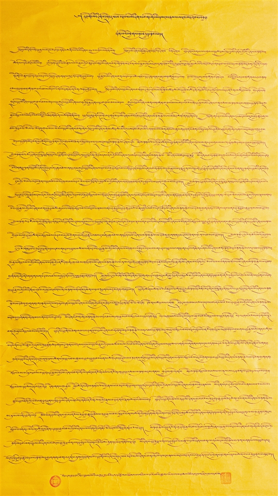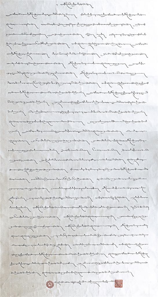 藏文書(shū)法一等獎(jiǎng)作品《在黨的民族政策光輝照耀下各族人民繁榮發(fā)展》。作者 索朗歐珠