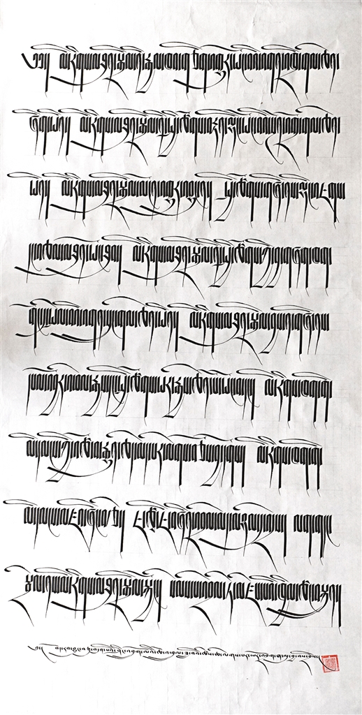 藏文書(shū)法二等獎(jiǎng)作品《維護(hù)國(guó)家統(tǒng)一、加強(qiáng)民族團(tuán)結(jié)是各族人民的共同責(zé)任》?!∽髡摺“赚敿哟?/p>
