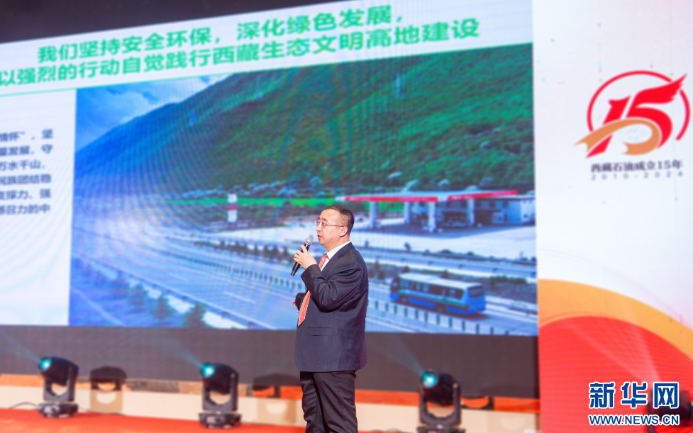 4月28日,中國(guó)石化西藏石油分公司代表、黨委書(shū)記施長(zhǎng)春在活動(dòng)現(xiàn)場(chǎng)發(fā)布中國(guó)石化西藏石油社會(huì)責(zé)任報(bào)告。新華網(wǎng) 旦增努布 攝