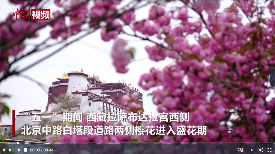 “五一”期間,西藏拉薩布達拉宮西側北京中路白塔段道路兩側櫻花進入盛花期,花枝爛漫,引來不少過往市民、游客駐足拍照“打卡”。北京中路附近正好有個公交站臺白塔站,市民、游客可花下乘車,春夏之交,高原景色宜人。(記者 江飛波 制作 劉鵬)