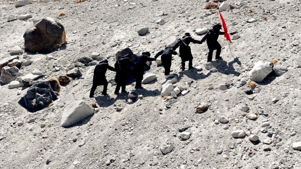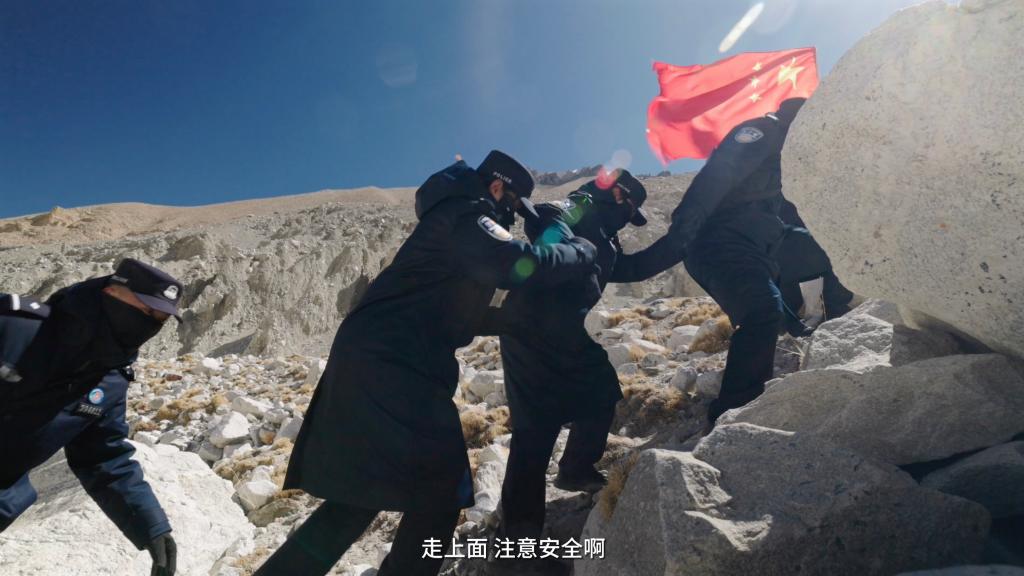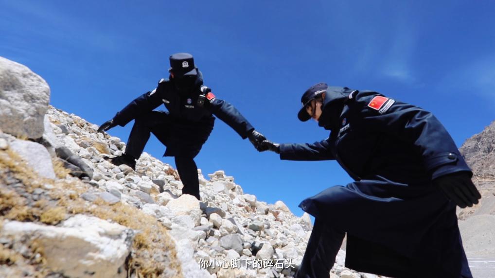 一路上,巡邏隊(duì)經(jīng)過了冰塔林、冰川,穿越了碎石灘,“踏上路程的時(shí)候是有點(diǎn)緊張和忐忑的,因?yàn)楦杏X其實(shí)這路很爛,全是亂石堆,就很害怕自己沒辦法堅(jiān)持下來,因?yàn)閺膩頉]有到過海拔這么高的地方”,新警彭莉緊張地說道。