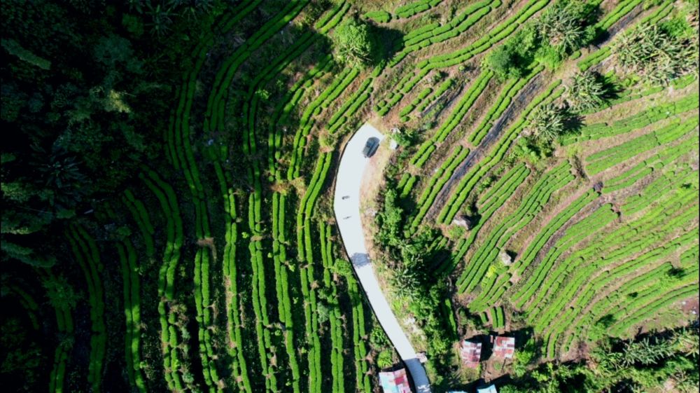 茶場道路順著山谷延伸,像一條絲帶纏繞在翠綠的山上,與國道559線扎墨段(即