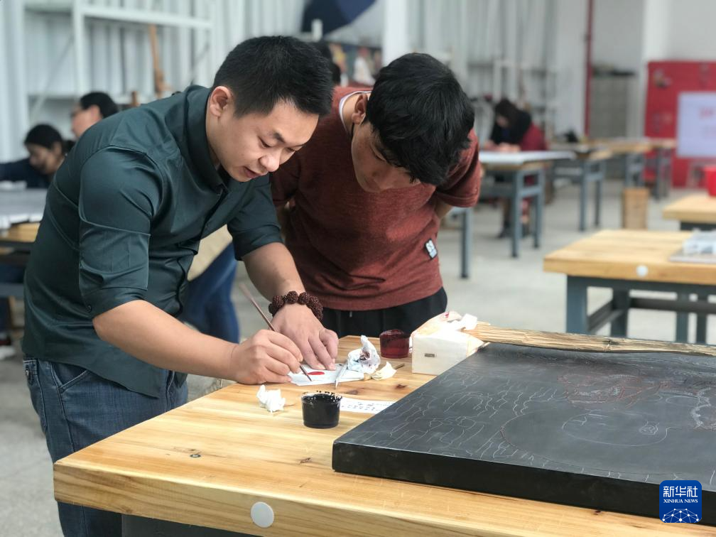 2018年,仁青郎加(右)正跟老師學(xué)習(xí)漆畫(huà)技法。新華社發(fā)