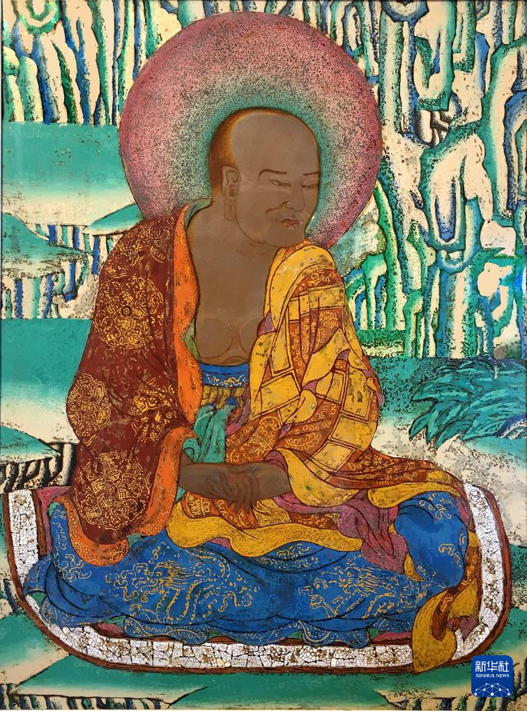 仁青郎加的第一幅唐卡漆畫(huà)作品——《指小路尊者》。新華社發(fā)