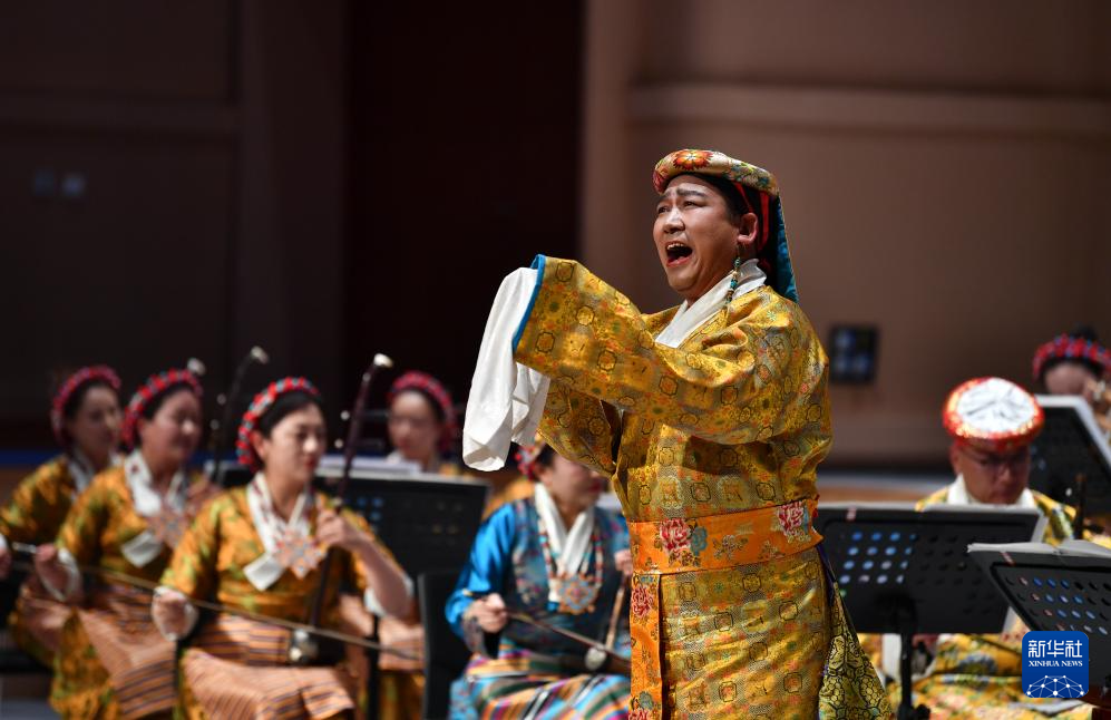 5月20日,在西藏傳統(tǒng)民族音樂(lè)會(huì)《吉祥妙音》演出現(xiàn)場(chǎng),演員演唱堆諧《阿覺(jué)索朗多布杰》。新華社記者 晉美多吉 攝