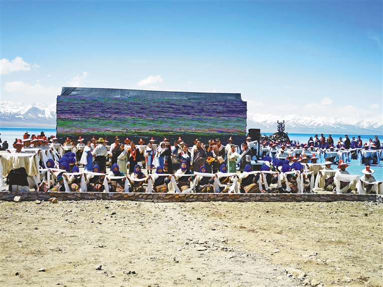 由300名演員將象征平安、吉祥的馬、牦牛、牛角、五彩哈達等元素融入表演全過程,藝術地展現(xiàn)獨有的開湖祈福場景。