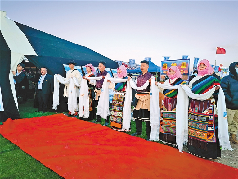 開湖意味著旅游旺季的到來。當雄縣、尼木縣、曲水縣、城關區(qū)等縣區(qū)都搭起彩色帳篷,展示特色美食、文創(chuàng)產(chǎn)品和非遺文化。各縣區(qū)的文旅局長們集體“出攤”,向來賓做著熱情細致的宣介。林周縣的帳篷前,4位藏族農(nóng)牧民跳起舞蹈,這是從夯墻勞作中誕生的傳統(tǒng)舞蹈“阿嘎舞”;達孜區(qū)展出青稞精釀白啤酒、以黑頸鶴為靈感創(chuàng)作的文創(chuàng)產(chǎn)品、知名品牌的古檀香等特色商品;曲水縣在醒目位置放置著全域旅游手繪地圖、文旅產(chǎn)業(yè)招商引資項目介紹等手冊。