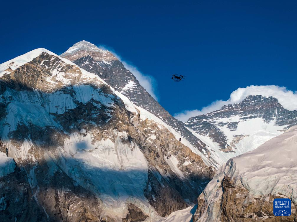 4月30日,大疆運載無人機(jī)在珠穆朗瑪峰尼泊爾一側(cè)進(jìn)行物資運輸測試(視頻截圖)。新華社發(fā)