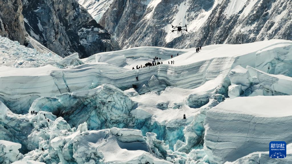 4月30日,大疆運載無人機(jī)在珠穆朗瑪峰南坡昆布冰川進(jìn)行物資運輸測試(視頻截圖)。新華社發(fā)