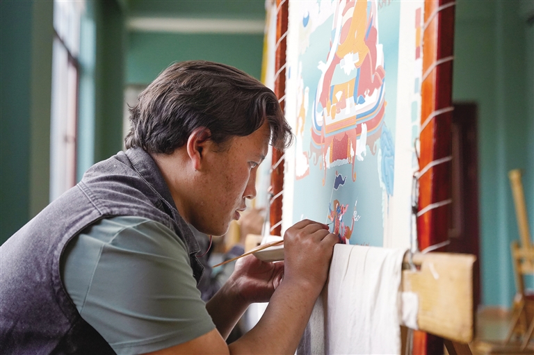 唐卡,2006年被列入國家非遺名錄,其題材豐富,包含歷史、文化和生活。昌都嘎瑪嘎赤畫派傳承人羅珠巴松出生在唐卡世家,是嘎赤派大師烏欽·敦德拉松的后代,他自幼學(xué)習(xí)唐卡,7歲啟蒙,8年筑基,19歲獨立創(chuàng)作,21歲收徒,31歲被認(rèn)定為自治區(qū)級非遺傳承人,41歲被認(rèn)定為國家級非遺傳承人。在西藏嘎欽唐卡畫院,他分享了自己學(xué)習(xí)、傳承發(fā)揚唐卡的故事。