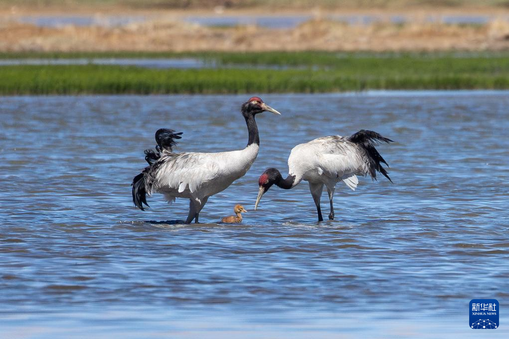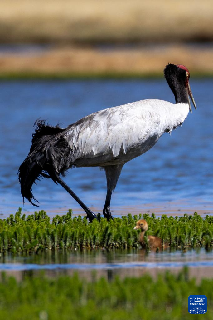 6月9日,黑頸鶴帶著雛鳥(niǎo)在西藏那曲市申扎縣一處濕地棲息、覓食。新華社記者 姜帆 攝
