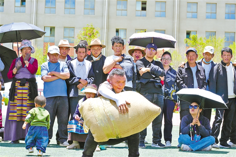 桑珠孜區(qū)城北街道舉辦慶祝第八個(gè)“日喀則市民族團(tuán)結(jié)進(jìn)步日”暨“全民來健身 健康你我他”社區(qū)運(yùn)動(dòng)會(huì)。這是參賽選手在進(jìn)行抱石頭比賽。
