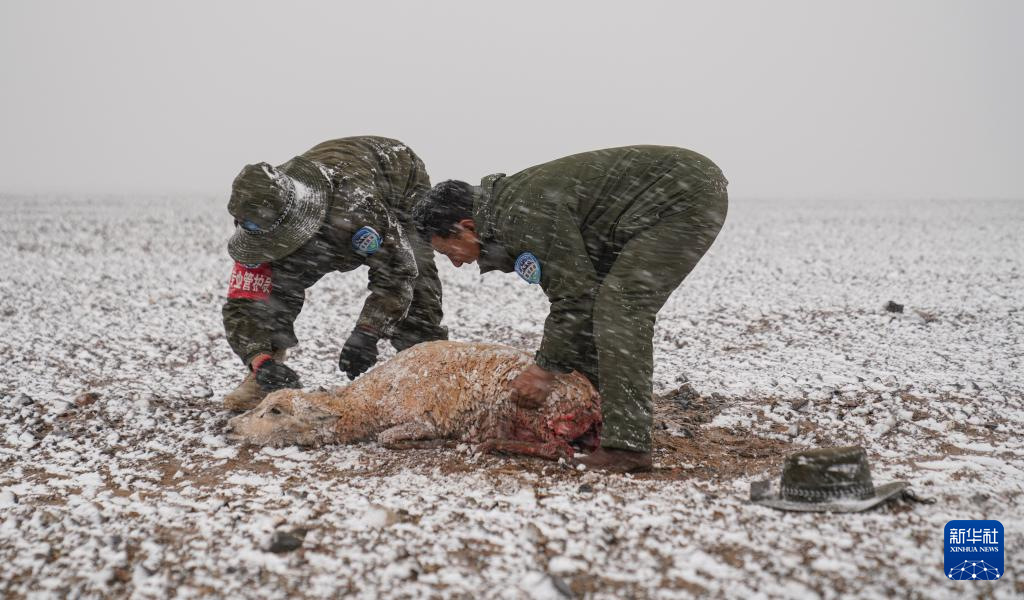 6月14日,西藏那曲市尼瑪縣境內(nèi)的羌塘國(guó)家級(jí)自然保護(hù)區(qū)“無(wú)人區(qū)”深處,在野生動(dòng)物專業(yè)管護(hù)隊(duì)臨時(shí)宿營(yíng)地附近,一只在藏羚羊遷徙路上等候已久的野狼撲向遷徙的藏羚羊群中一只懷孕的母羊,咬向肚子和脖子。激烈掙扎的藏羚羊掙脫后,靠著最后的一點(diǎn)力氣跑向野保隊(duì)營(yíng)地,野狼不敢靠近營(yíng)地而不得不離去。野保隊(duì)員看到在風(fēng)雪中掙扎的母羊,把它運(yùn)回營(yíng)地進(jìn)行救助。但由于傷勢(shì)太重,肚皮被咬開(kāi)且內(nèi)臟嚴(yán)重受損,野保隊(duì)員只能將母羊的肚皮縫上之后,按照慣例將受傷的母羊抬放在羌塘大草原。