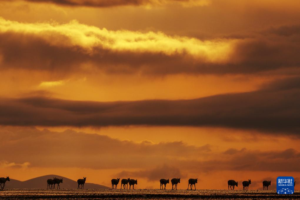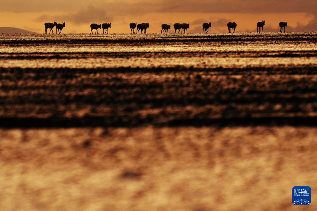 6月14日,在西藏那曲市尼瑪縣境內(nèi)的羌塘國(guó)家級(jí)自然保護(hù)區(qū)“無(wú)人區(qū)”深處,一群藏羚羊迎著朝陽(yáng),行進(jìn)在遷徙路上。新華社記者 費(fèi)茂華 攝