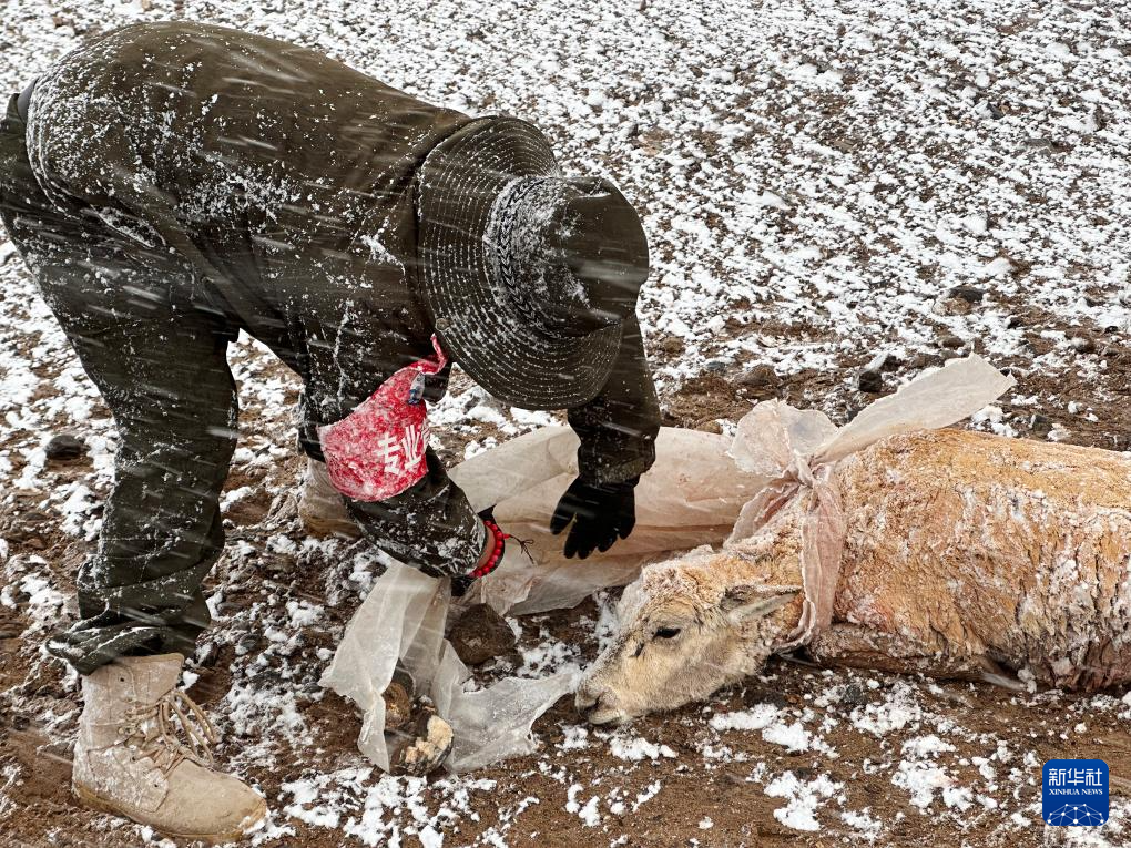 羌塘國(guó)家級(jí)自然保護(hù)區(qū)的野保員在安撫受傷的母藏羚羊(6月14日攝)。新華社發(fā)(旦增攝)