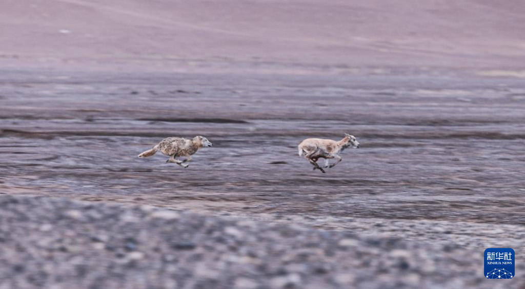 一只野狼奔向遷徙藏羚羊群中一只懷孕的母藏羚羊(6月14日攝,視頻截圖)。新華社發(fā)(達(dá)瓦多吉攝)
