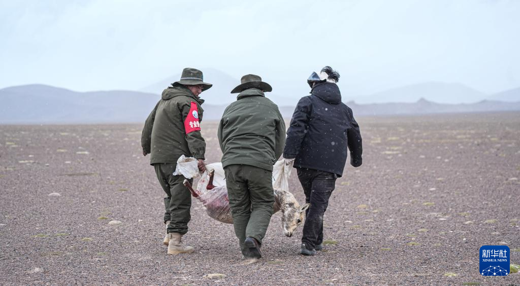 羌塘國(guó)家級(jí)自然保護(hù)區(qū)的野保員把受傷的母藏羚羊抬到臨時(shí)營(yíng)地附近(6月14日攝)。新華社發(fā)(旦增攝)