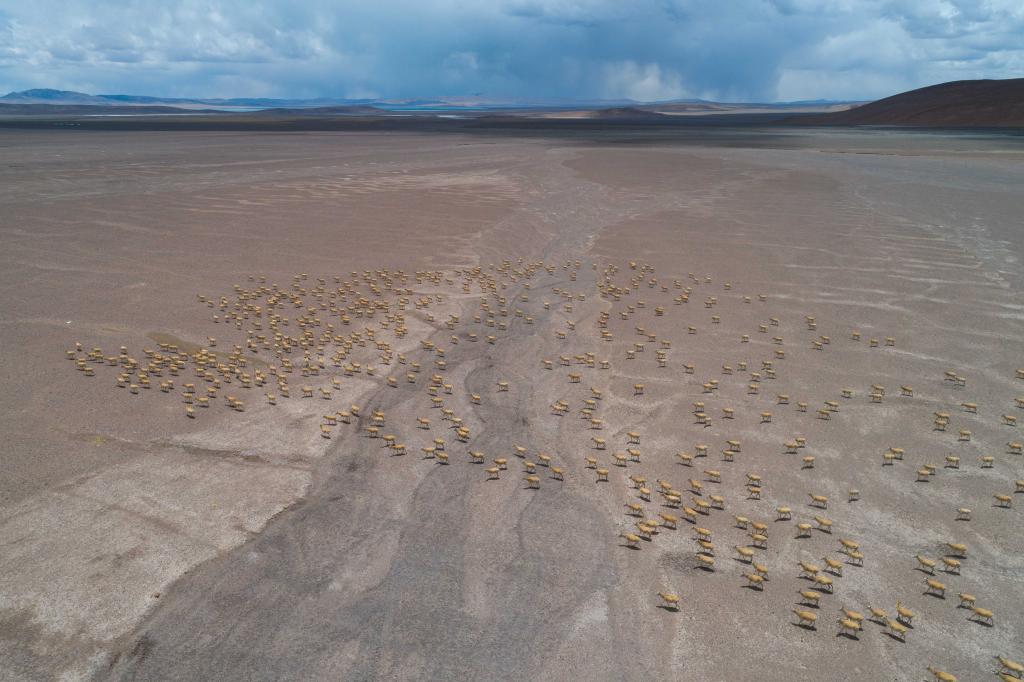 藏羚羊在羌塘保護區(qū)核心區(qū)向產(chǎn)羔地遷徙(6月13日攝 無人機照片)。新華社記者 旦增尼瑪曲珠 攝