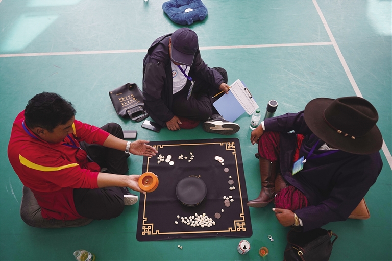 當(dāng)日,“吉韌”“秀茲”等項(xiàng)目一同開(kāi)賽。 “吉韌”也叫藏式克郎球,是藏族的一種彈指運(yùn)動(dòng)。比賽在一張邊長(zhǎng)約1米的正方形木桌球臺(tái)上進(jìn)行,球臺(tái)四角有4個(gè)小洞,黑、白兩種扁圓形球子各9個(gè),另有1個(gè)紅色球子放置在球臺(tái)中心,1個(gè)白色母球供雙方彈擊球子所用。