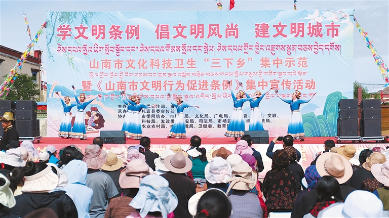 近日,山南市委宣傳部、市文明辦聯(lián)合扎囊縣委宣傳部在扎囊縣阿扎鄉(xiāng)章達(dá)村,開展了以“學(xué)文明條例 倡文明風(fēng)尚 建文明城市”為主題的山南市文化科技衛(wèi)生“三下鄉(xiāng)”集中示范暨《山南市文明行為促進(jìn)條例》集中宣傳活動(dòng)?!D為活動(dòng)現(xiàn)場(chǎng)。記者 汪純 攝