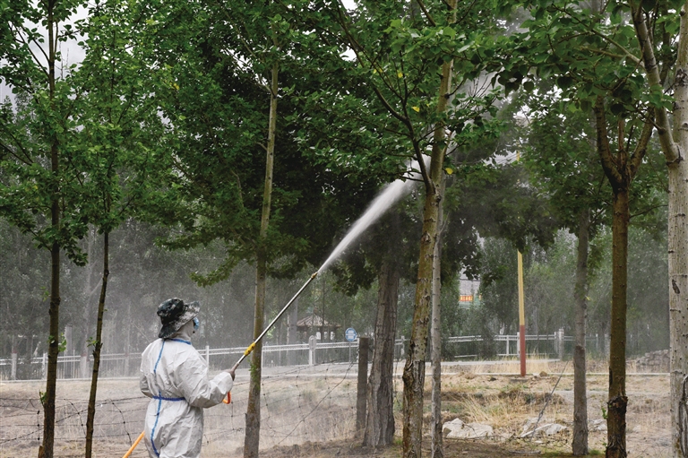 病因找到了,如何對癥下藥才是關(guān)鍵。防治隊(duì)將整片楊樹林分成三個(gè)區(qū)域,首先伐掉干死腐爛的樹,其次對病害區(qū)域進(jìn)行殺菌消毒?!懊總€(gè)區(qū)域我們噴灑的藥劑也不同,主要是想對防治效果進(jìn)行實(shí)驗(yàn)。通過持續(xù)兩個(gè)月的觀察,發(fā)現(xiàn)第一組藥劑防治效果明顯,因此我們開始在整片楊樹林推廣第一組藥劑?!秉S敏說。